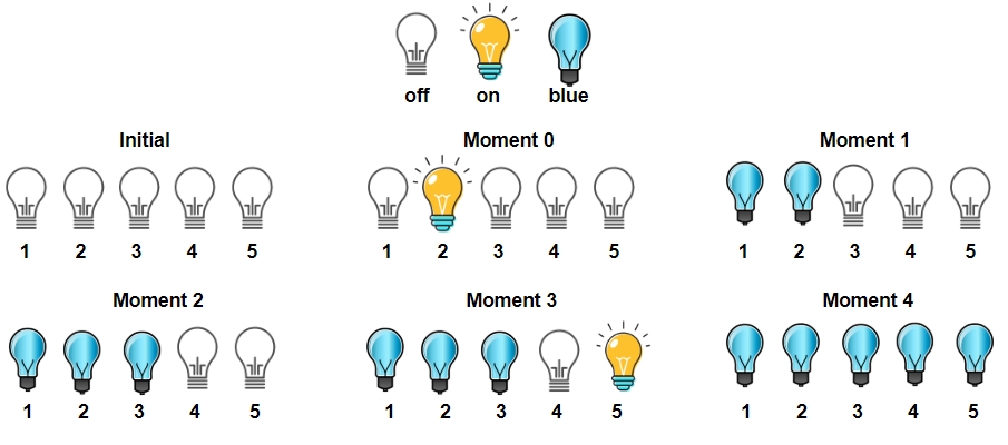 Explanation: All bulbs turned on, are blue at the moment 3 (index-0).
