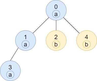Explanation: Node 0 has label 'a' and its sub-tree has node 2 with label 'a' as well, thus the answer is 2. Notice that any node is part of its sub-tree.