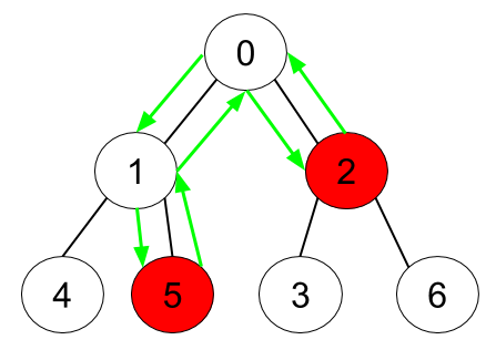 Explanation: The figure above represents the given tree where red vertices have an apple. One optimal path to collect all apples is shown by the green arrows. Input: n = 7, edges = [[0,1],[0,2],[1,4],[1,5],[2,3],[2,6]], hasApple = [false,false,true,false,false,true,false]