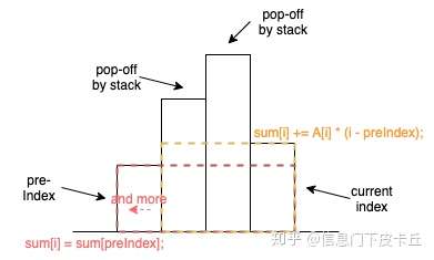 和上个解法同理,从右往左遍历k in [j, 0],mi为当前遍历的最短高度,res += mi(k) for all k。此时如果能统计出以heights[j]向左最远能到的位置如peek,再加上peek前的结果也就是对j列所求。比如图中最后一列(2+2+2 + 3)前面三个2为之前第3列所求,最后的3为当前列的高度*它对应的宽度1。让dp[k]记录第k列所增加的新长方形数目。求最远能扩所少想起Largest Rectangle in Histogram,类似的按高度递增的stack内记录index,不同在于这次宽度不是对每个弹出的元素做计算,而是所有弹出后计算i和peek的diff: